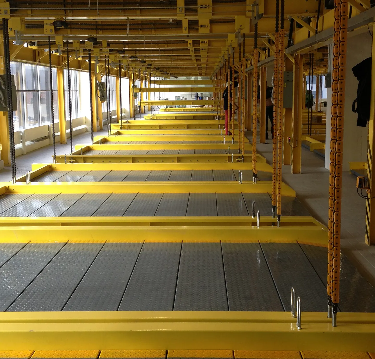 Our two-level suspended display system lifts vehicles on platforms supported from a structural frame or ceiling, creating a striking floating effect. Cars are showcased above drive aisles or open space while keeping the area below fully usable.